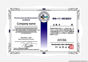 | 2021年11月・ | 都庁から申請中の環境イオン測定認証事業を認証する通知をいただく。 下記は環境イオン測定認証事業で授与する賞状です。 ![]() |